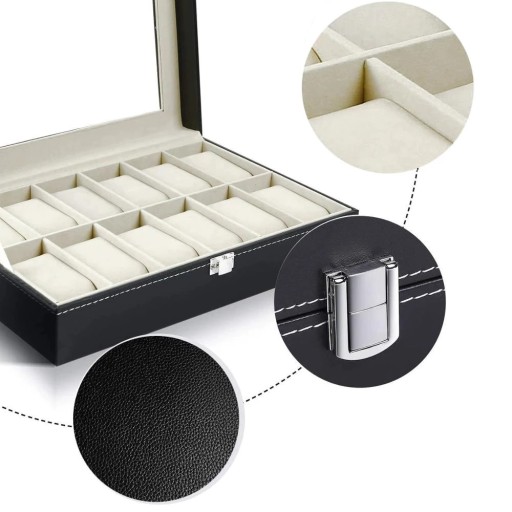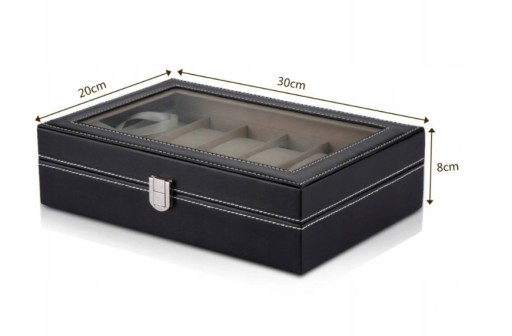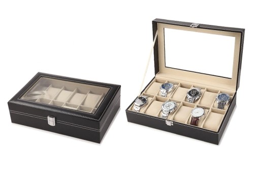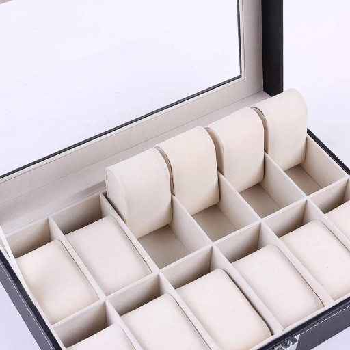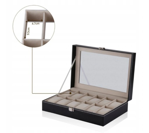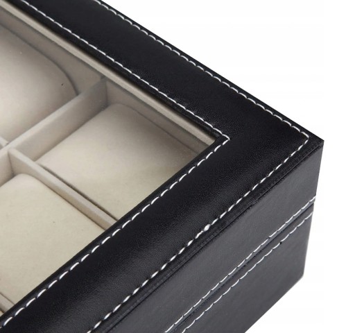 Eleganckie pudełko na zegarki posiada aż 12 przegródek, w których można umieścić nie tylko zegarki, ale również inną biżuterię. Kasetka ma elegancki, czarny kolor i widoczne jaśniejsze szwy, co dodaje całości elegancji i stylu. Wieczko etui na zegarki jest przezroczyste (szybka), dzięki czemu pudełko na zegarki możemy wykorzystać nie tylko do przechowywania, ale również do eleganckiego eksponowania zawartości.