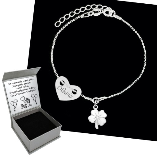 Przedmiotem oferty jest srebrna bransoletka ze śliczną zawieszką koniczynka i sercem pod grawer. Niepowtarzalny prezent dla dziewczynki na każdą okazję!