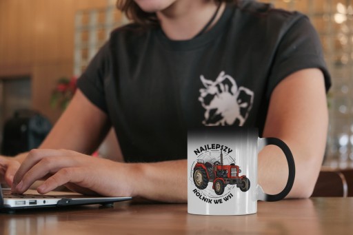 - Kubek normalnie jest w kolorze czarnym a sam nadruk nie jest widoczny. Po zalaniu ciepłym płynem ukazuje się nadruk. Następnie po wychłodzeniu, znowu robi się czarny