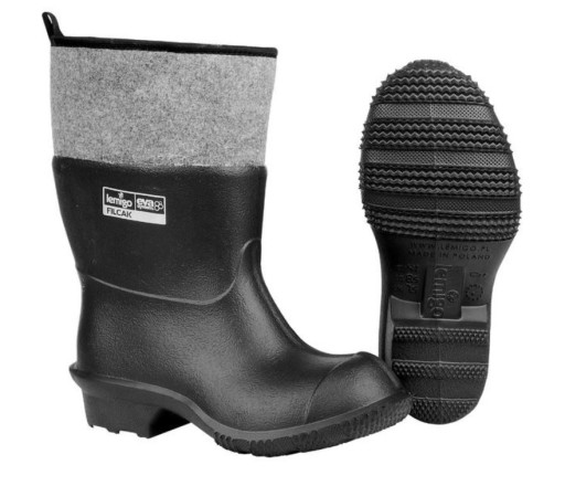 Gumofilce FILCAK EVA 804 LEMIGO wykonane są tworzywa EVA dodatkowo z wkładem filcowym oraz z wkładką, dzięki czemu są bardzo lekkie, wytrzymałe oraz wodoodporne, co korzystnie wpływa na komfort poruszania się. Filc wykończony jest ozdobną lamówką, której zakończenie ułatwia zakładania buta. Podeszwa gwarantuje przyczepność, odporność na niskie temperatury. Posiadają wysoki przegub ułatwiający wygodne wkładanie i zdejmowanie obuwia.Te wytrzymałe i funkcjonalne gumofilce zapewniają pełną ochronę przed wilgocią w bardzo trudnych warunkach. Kalosze przeznaczone są do pracy na zewnątrz i wewnątrz pomieszczeń – sprawdzają się w gospodarstwie, na działce, a także podczas podczas grzybobrania lub łowienia ryb.