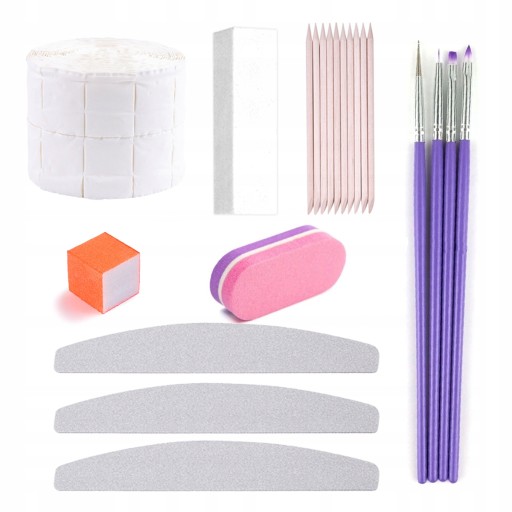 Набор для ногтей, пилка, блок, ватные палочки, палочки, кисточка.