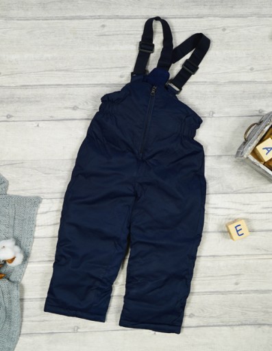 Kombinezon zimowy dla dziecka, w skład którego wchodzą: zapinana na suwak i rzepy ciepła, granatowa kurtka zimowa w zielone trójkąty i napisy "DINOSAUR" oraz granatowe spodnie typu narciarskiego.