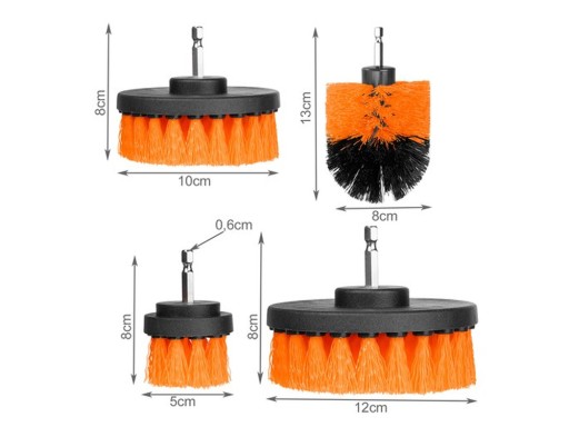 Zestaw wysokiej jakości szczotek - nasadek o różnych średnicach do wkretarki/ wiertarki. Wykorzystanie napędu obrotowego wiertarki/ wkrętarki umożliwi błyskawiczne usunięcie nawet najcięższych zabrudzeń. Końcówki o nasadzie 1/4'' pasują do większości wiertarek/ wkrętarek na rynku.