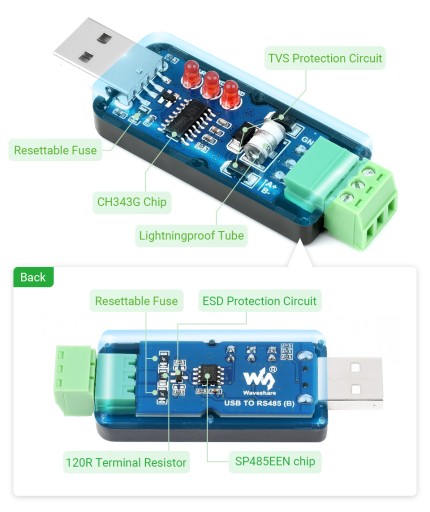 Przemysłowy konwerter USB na RS485 z oryginalnym układem CH343G. Posiada wbudowane obwody ochronne, takie jak: