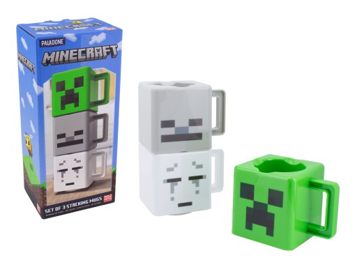 - Każdy kubek przedstawia inny mob z gry – zielony wybuchowy Creeper, szary nieumarły szkielet oraz biały duch podobny do Ghasta