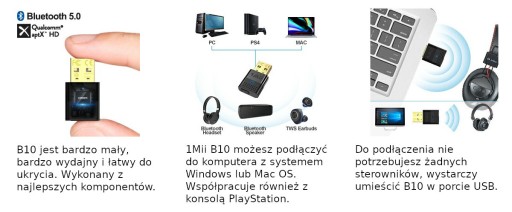 Model B10 to małe i kompaktowe urządzenie pełniące rolę nadajnika audio USB. Wystarczy podłączyć je do portu USB w komputerze z systemem Windows lub Mac, a system operacyjny sam zainstaluje je wśród urządzeń dżwięku. 1Mii B10 pozwala na podłączenie dwóch urządzeń odbierających sygnał audio jednocześnie (np. dwie pary słuchawek bezprzewodowych). Urządzenie wspiera profesjonalne kodeki audio, takie jak aptX LL/HD. Zastosowanie najnowszych komponentów gwarantuje daleki zasięg transmisji i brak opóźnień w odbieranym sygnale.