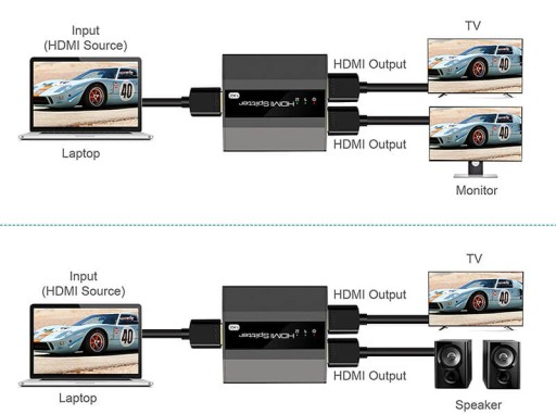 - Jedno wejście HDMI sygnał podzielony na dwa urządzenia HDMI