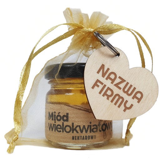 Słoiczki wypełnione prawdziwym miodem z drewnianym spersonalizowanym breloczkiem, całość w woreczku z organzy.