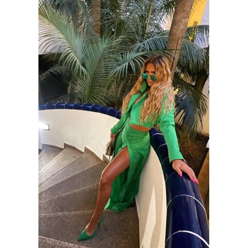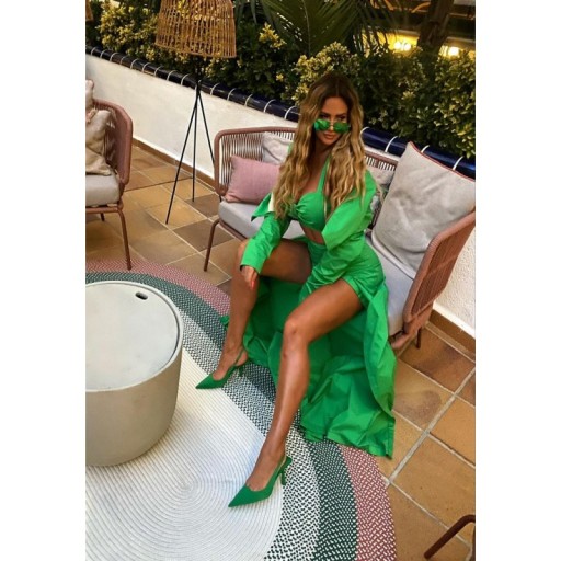 Spodnie w pięknej żywej zieleni z eleganckiej bawełnianej tkaniny. spodnie z wysokim stanem i długimi szerokimi nogawkami. Posiadają zakładkę z przodu wzdłuż pod którą znajdują się kryte guziki, dające możliwość rozpięcia nogawek i stworzenia rozcięcia na dowolnej wysokości. Zapinane na zamek z tyłu.