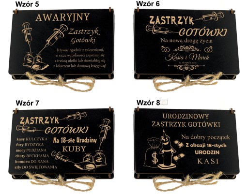 Wychodząc naprzeciw Państwa oczekiwaniom stworzyliśmy skrzynkę w postaci ZASTRZYKU GOTÓWKI, który sprawi miłą niespodziankę obdarowanemu. Mogą Państwo wręczyć prezent w taki sposób, że nie tylko zawartość będzie prezentem, ale także ich opakowanie. Taki prezent z pewnością zaskoczy każdego. Naszym kuferkiem mogą Państwo zastąpić nudne plastikowe lub tekturowe opakowania. Skrzynka z Państwa indywidualną dedykacją i życzeniami, będzie stanowić niezapomnianą pamiątkę na długie lata.