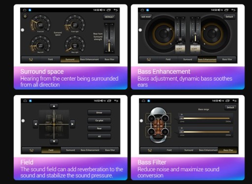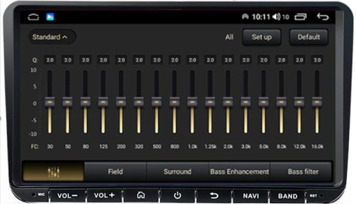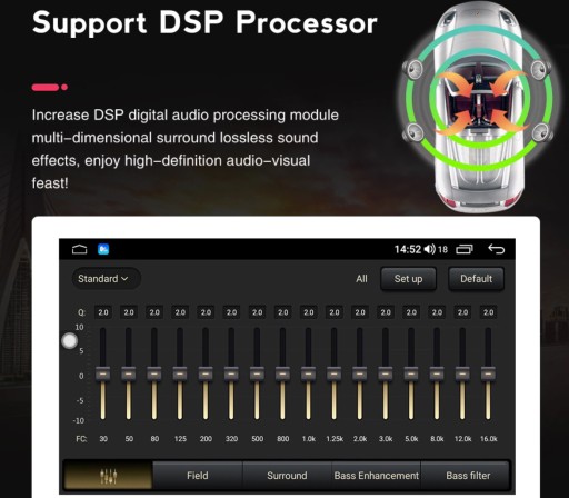 - Cyfrowy procesor dźwięku i korektor graficzny (EQ) zapewniają wysokiej jakości dźwięk, który zaspokoi nawet najbardziej wymagających melomanów! Wbudowanych jest kilka trybów zdefiniowanych EQ (Rock, Pop, Jazz itp) jak również pozostawiona została możliwość dowolnej korekcji przez użytkownika. Posiada funkcję LOUDNESS. Radio ma również opcję FADER, którą możemy zmieniać proporcję dźwięku między poszczególnymi głośnikami.