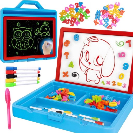 Układaj, rysuj, pisz i zmazuj, wspaniała twórcza zabawa i nauka bez końca. Plastikowa walizka zawiera wszystko czego potrzebuje maluszek do kreatywnej zabawy. Strona z białą tablicą magnetyczną służy do układania magnetycznych literek i cyferek, pisania i rysowania pisakami suchościeralnymi.
