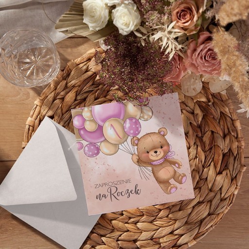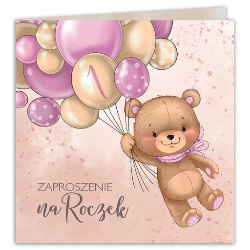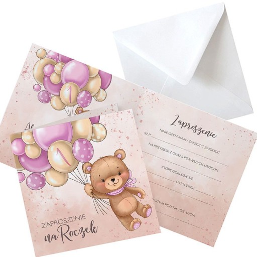 - KOMPLET: 10szt zaproszeń na Roczek dziewczynki oraz 10szt dopasowanych kopert; zaproszenia udekorowane UROCZĄ GRAFIKĄ MISIA Z BALONIKAMI w różowym kolorze
