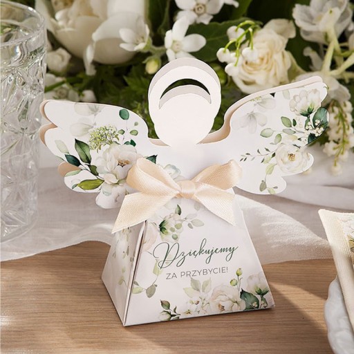 PUDEŁECZKA podziękowanie Aniołek Białe Kwiaty 10szt (+wstążki)