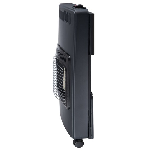 Po bokach obudowy wycięte zostały uchwyty, które ułatwiają przenoszenie piecyka w inne miejsce, a obrotowe kółka zapewnią mobilność urządzenia nawet z wsadzoną pełną butlą.