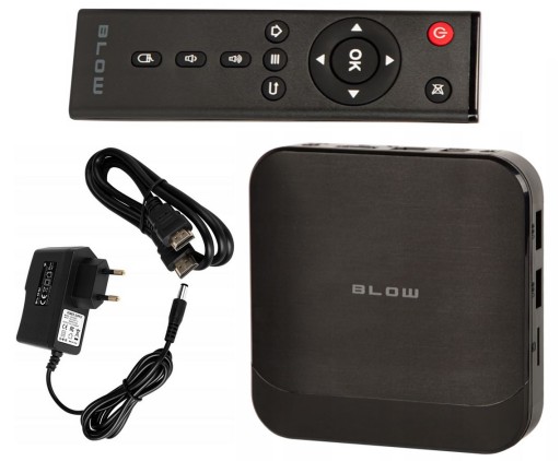 Nowy odtwarzacz multimedialny smart tv box V2 BLOW WIFI Bluetooth kolor czarny , Pilot zdalnego sterowania , Zasilacz sieciowy 230V , Przewód HDMI - HDMI 1m , Instrukcja obsługi w języku Polskim , Oryginalne opakowanie BLOW AUDIO