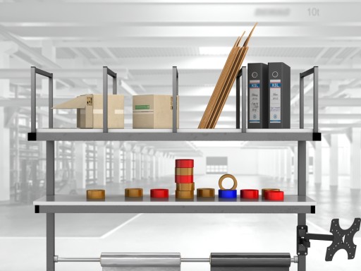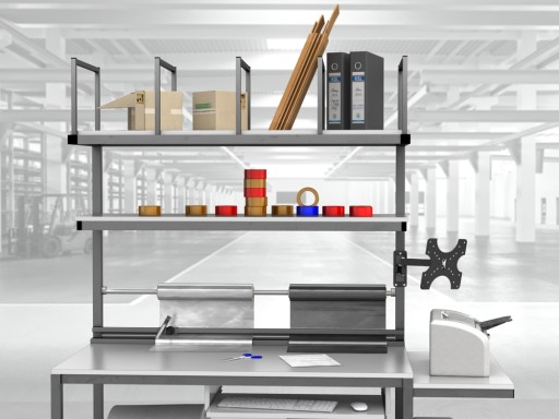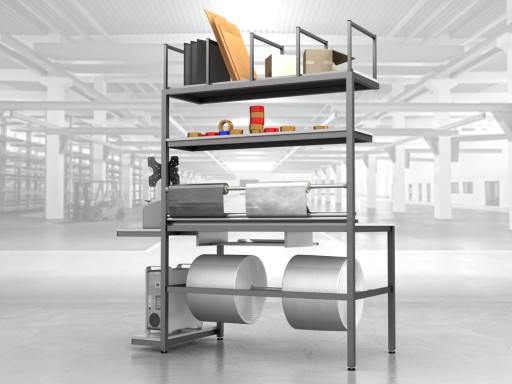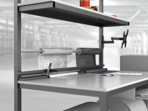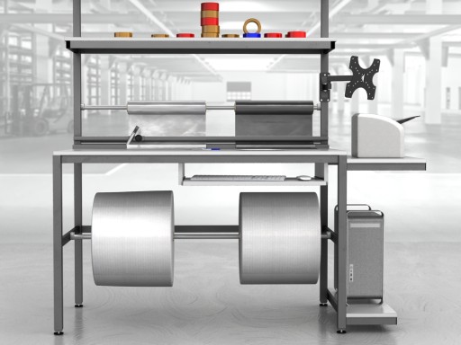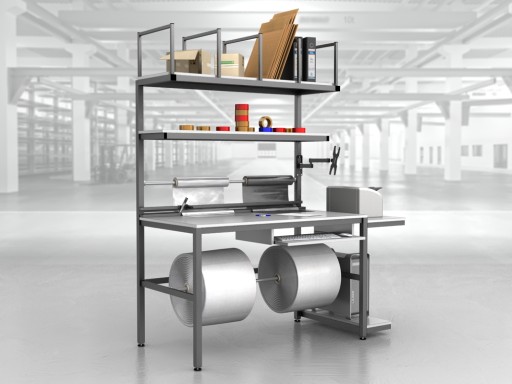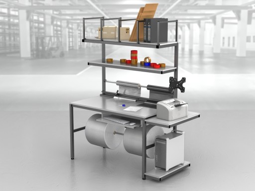Wysokiej jakości stół warsztatowy do pakowania paczek wykonany z profili metalowych spawanych w stabilną bryłę.