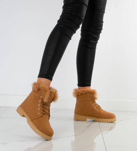 Ciepłe botki wykonane z ekoskóry. Wewnątrz ocieplane miękkim futerkiem (również na wkładce). Model sznurowany, posiada podeszwę typu traper. Idealne na zimę!
