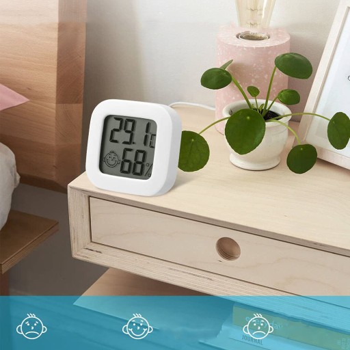 Wewnętrzna, elektroniczna stacja pogody z wbudowanym czujnikiem temperatury oraz higrometrem - niezwykle przydatna w każdym domu, szczególnie w pokoju dziecka, gdzie kluczowej jest utrzymanie odpowiedniej temperatury oraz wilgotności powietrza.