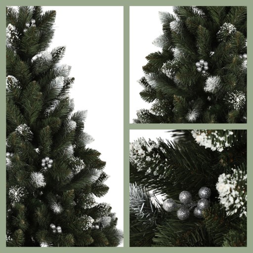 ⭐OZDOBIONA – na gałązkach oprócz szkła dekoracyjnego, znajdziesz także perełki imitujące zamarzniętą jarzębinę. Srebrne brokatowe kuleczki zagęszczają gałązki choinki, dzięki czemu nie wymaga dodatkowych dekoracji.