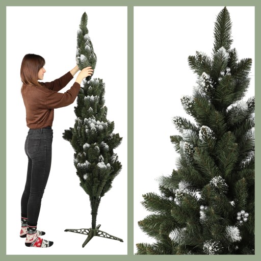 ⭐GĘSTA – ośnieżona sztuczna choinka wyróżnia się na tle świątecznych drzewek. Jej gęsta korona i pięknie oszronione gałęzie zapewniają doskonałe tło dla dekoracji. Wykonana z wytrzymałej folii PCV złożona jest z 385 gałązek.
