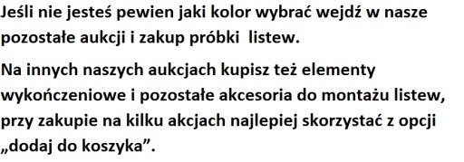 Kolor listew może nieznacznie różnić się od tego jaki widzisz na ekranie telefonu lub komputera, wynika to np z ustawień jasności ekranu , jakości monitora lub innych filtrów dostępnych w urządzeniu.