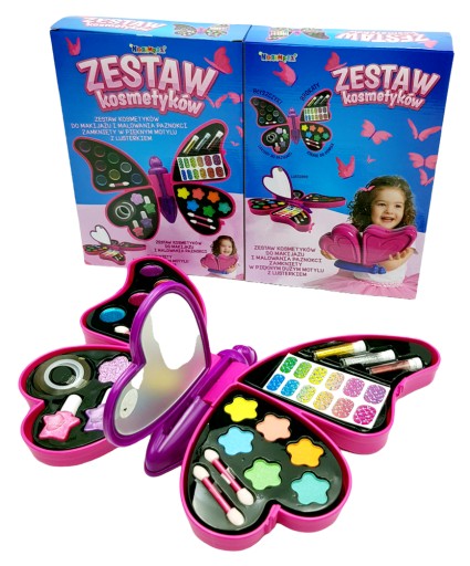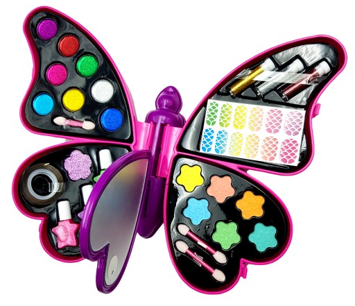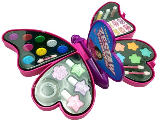 Fantastyczny zestaw do makijażu z wieloma kosmetykami kreującymi naturalny, zachwycający wygląd, podkreślającymi piękno każdej dziewczynki. Szykowna podręczna toaletka w kształcie motylka na ulubione kosmetyki. od cieni poprzez lakiery, na brokatach kończąc, aby malować się i nieustannie bawić z koleżankami.