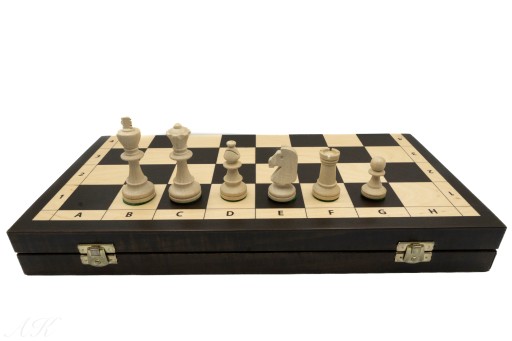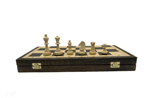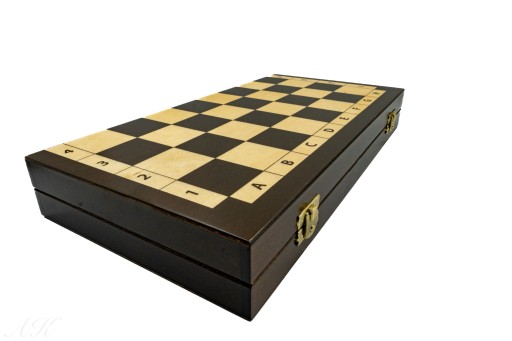 Szachownica malowana metodą sitodruku. Całość zabezpieczona trwałym lakierem, zdobiona podwójnym okuciem.