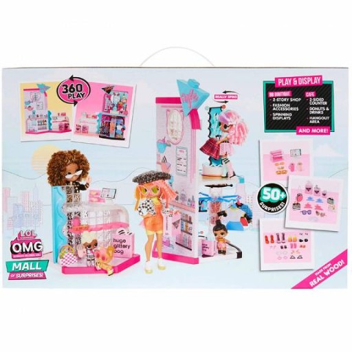 Dwupiętrowy B.B. Boutique zawiera stojaki na ubrania, które naprawdę się obracają, aby pokazać wszystkie dołączone do zestawu szalone modne gadżety i akcesoria dla tych lalek LOL, podczas gdy miejsce spotkań w kawiarni jest wyposażone w dwustronny blat gotowy do zamawiania i serwowania różnych przekąsek i słodkości, w tym pyszne pączki i napoje. W LOL Surprise OMG Mall of Surprises możesz robić zakupy i bawić się wszystkimi lalkami LOL Surprise Tween, OMG, laleczkami kolekcjonerskimi i nie tylko!