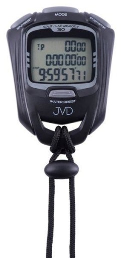 Stoper ST81 firmy JVD. Klasa szczelności WR. Obudowa z tworzywa sztucznego. Pamięć 30 międzyczasów (LAP). Metronom (18 zdefiniowanych ustawień). Timer. Interwały. Licznik. Zegar. Alarm