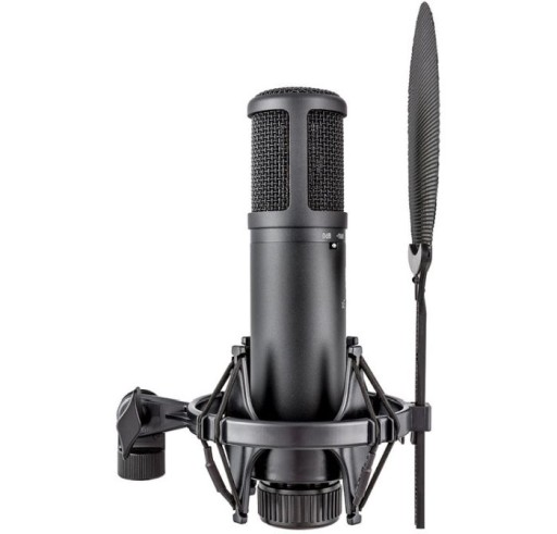 Mikrofon pojemnościowy, charakterystyka kardioidalna, membrana 1 cal, przełączniki filtra dolnozaporowego oraz tłumika -10dB, w zestawie uchwyt elastyczny oraz metalowy pop-filtr