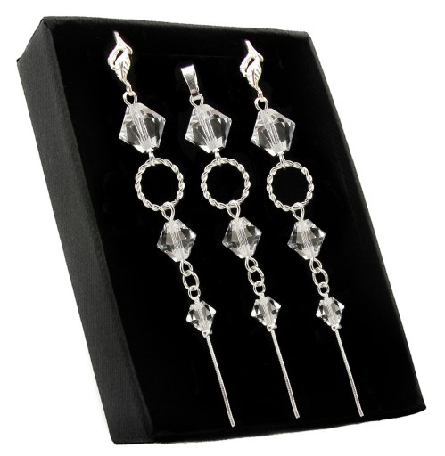 Długość kolczyków ok. 8cm. Długość zawieszki 7,5cm. Komplet wykonany ze stopniowanych kryształów Swarovski Crystal 10mm, 8mm i 6mm, oraz srebra próby 925. Komplet ocechowany