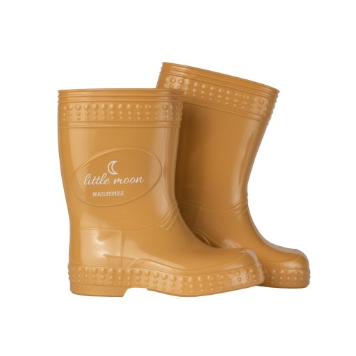 Wnętrze kaloszy jest wypełnione białą skarpetką wewnętrzną, która jest zakładana już w procesie produkcyjnym. Składa się ona w 100% z bawełny. Na zewnątrz widzimy piękny, karmelowy kolor wraz ze stylową naklejką z napisem „little moon” oraz motywem księżyca. Naklejki te są dokładnie zgrzewane w procesie produkcyjnym, dzięki czemu cechują się one odpornością na zniszczenia.
