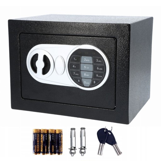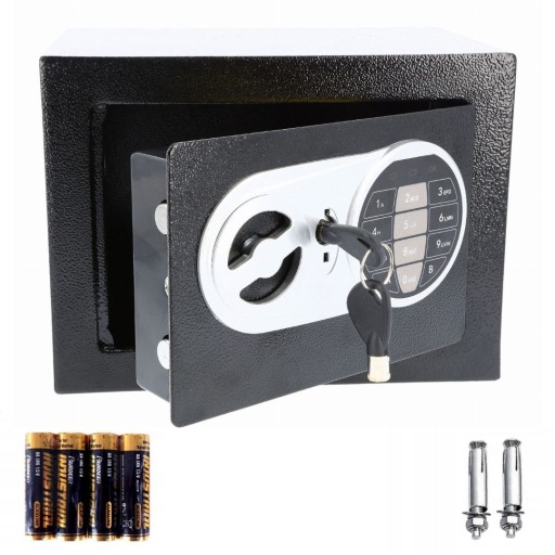 ⛔️ Solidna stalowa konstrukcja, dodatkowo zawiera elementy mocujące do ściany. Sejf znajduje się w oryginalnym opakowaniu!