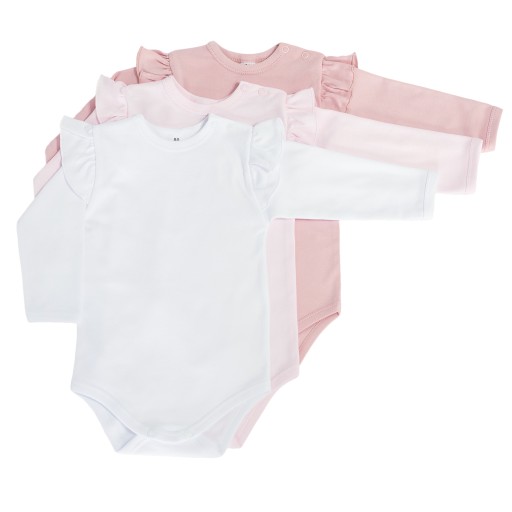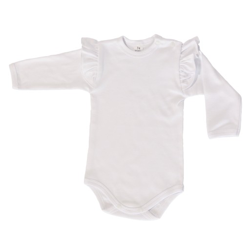 Klasyczne, wygodne i praktyczne body z długim rękawkiem i falbanką na ramionkach uszyte z wysokiej jakości bawełny posiadającej certyfikat Oeko-Tex Standard 100 Tekstylia godne zaufania.