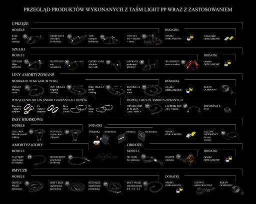 Ekwipunek do psich sportów, rekreacji i turystyki, a także akcesoria codziennego użytku, oraz sprzęt specjalnego przeznaczenia.