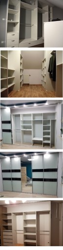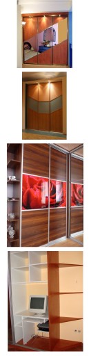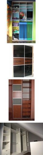 Szafy z drzwiami przesuwanymi lub tradycyjnie otwieranymi. Bogata kolorystyka, ponad 200 kolorów płyt - jednobarwnych lub drewnopodobnych.