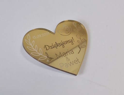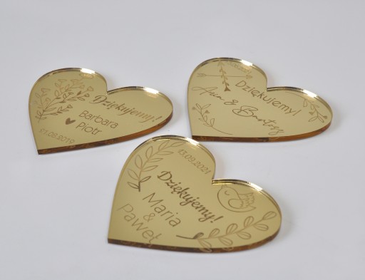 Podziękowania w kształcie serca z wygrawerowaną grafiką i treścią to gest wdzięczności, a zarazem pamiątka ślubna dla gości przybyłych na uroczystość. Magnesy mogą służyć również jako dekoracja stołu na przyjęciu weselnym.