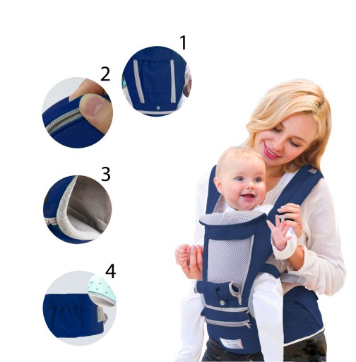 Nosidełko posiada 2 kieszonki na butelkę lub chusteczki/telefon w pasie biodrowym, co ułatwia podanie dziecku potrzebnych mu rzeczy w trakcie noszenia gdyż są "wyciągnięcie ręki"oraz 1 dużą kieszeń w zapinaną na dwa zamki, której otwarcie służy do stworzenia wywietrznika dla plecków dziecka. Ponadto w części tworzącej wywietrznik z siateczki znajduje się dodatkowo mała kieszonka na klucze lub karty.