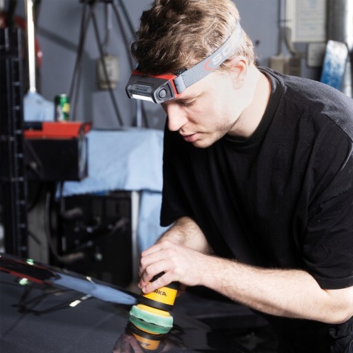 Latarka czołowa posiada bardzo wygodny, elastyczny pasek. Szybka regulacja jego długości pozwala dopasować go do obwodu głowy. Dzięki swojej niewielkiej wadze (100g) pozwala na komfortową pracę bez angażowania rąk. Urządzenie jest wodoszczelne i pyłoodporne według standardów IP65. Idealnie sprawdza się przy wszystkich pracach związanych z lakierowaniem, polerowaniem, czyszczeniem lub przygotowaniem powierzchni.