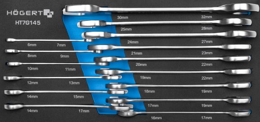 Klucze płaskie dwustronne: HT1W501 (6 x 7 mm), HT1W502 (8 x 9 mm), HT1W504 (10 x 11 mm), HT1W506 (12 x 13 mm), HT1W507 (13 x 17 mm), HT1W508 (14 x 15 mm), HT1W509 (16 x 17 mm), HT1W510 (17 x 19 mm), HT1W511 (18 x 19 mm), HT1W512 (19 x 22 mm), HT1W513 (20 x 22 mm), HT1W514 (21 x 23 mm), HT1W515 (24 x 27 mm), HT1W516 (25 x 28 mm), HT1W517 (30 x 32 mm).
