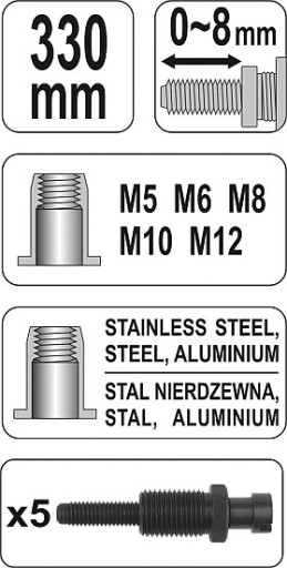 Zakres pracy - nitonakrętki od M5 do M12. Nitownica wykonuje połączenia materiałów za pomocą wewnętrznie gwintowanej tulei. Pozwala to na przykręcanie dodatkowych elementów wkrętami do metalu lub śrubami.