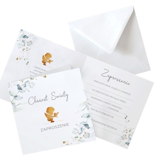 - KOMPLET: 10szt zaproszeń na Chrzest oraz 10szt dopasowanych kopert; zaproszenia udekorowane NAJMODNIEJSZĄ grafiką gałązek eukaliptusa i złotego aniołka z gołąbkiem