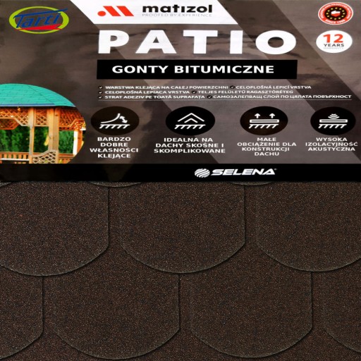 Matizol PATIO to gonty bitumiczne dedykowane do krycia dachów skośnych małej architektury, altanek, garaży oraz domków letniskowych. Odpowiednio dobrana mieszanka bitumiczna w połączeniu z osnową z welonu szklanego gwarantują 12 lat trwałości. Dzięki warstwie klejącej na całej spodniej powierzchni są łatwe w montażu i jednocześnie trwałe.