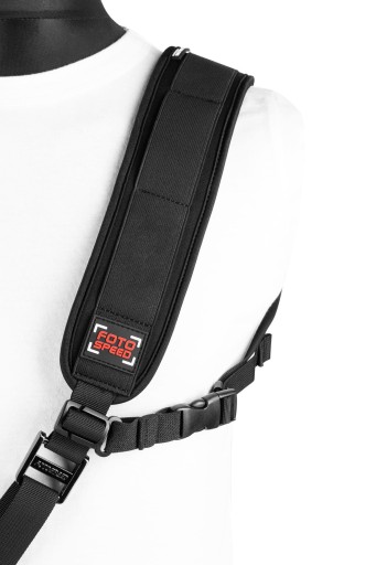 Część naramienna paska wykonana została z szerokiego neoprenu, zapewniającego wygodę noszenia nawet ciężkich aparatów. Od strony ramienia wszyta została miękka, gumowa wkładka zapobiegająca przesuwaniu się paska po ubraniu. Fotospeed F4 wyposażony został dodatkowo w zapinany pod pachą pasek, utrzymujący pewnie całość w wyznaczonym miejscu, nawet w trakcie wzmożonej aktywności.