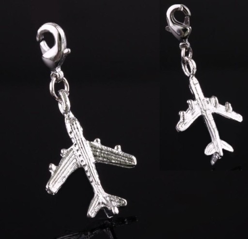 - Bardzo ładny element ozdobny - ZAWIESZKA CHARMS MAX 3D - MAKSYMALNY TRÓJWYMIAR - w kształcie SAMOLOTU . Element jest w kolorze SREBRNYM . Zawieszka posiada zapięcie - KARABIŃCZYK - dobrze ukazane w miniaturce w rogu zdjęcia! Produkt nie zawiera niklu ani ołowiu - antyalergiczny!