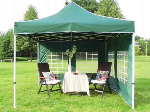 Składany pawilon ma teleskopowe nogi o regulowanej wysokości, które osiągają wysokość boczną ok. 2,30 m na najwyższym poziomie.