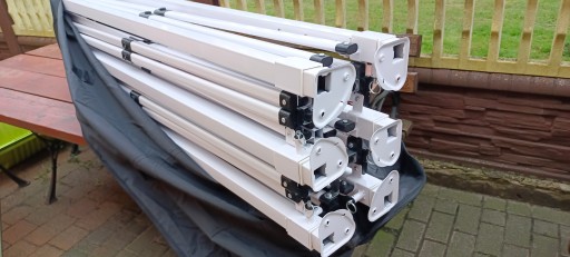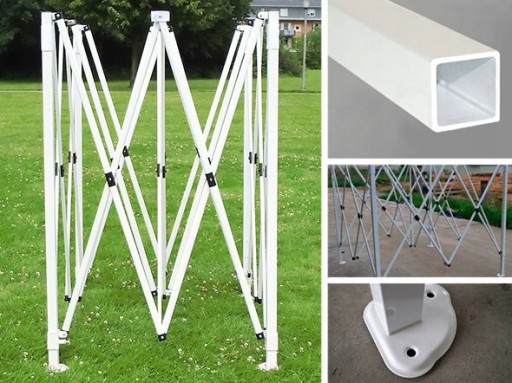 Profile stalowe mają średnicę około 40mm, a zatem są znacznie bardziej trwałe niż tradycyjne namioty o profilach 30mm. Dlaczego? 25% więcej stali, daje większą nośność oraz sztywność konstrukcji. Konstrukcja wykonana jest ze stali malowanej proszkowo na elegancki biały kolor
