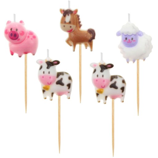 Świeczki w formie pikerów przedstawiających zwierząta mieszkające na farmie. Charakterystycznych dla farmy: koń, krowy, owca czy świnka z pewnością wzbogacą dekorację tortu lub innych słodkości podczas imprezy urodzinowej małego fana tych klimatów!