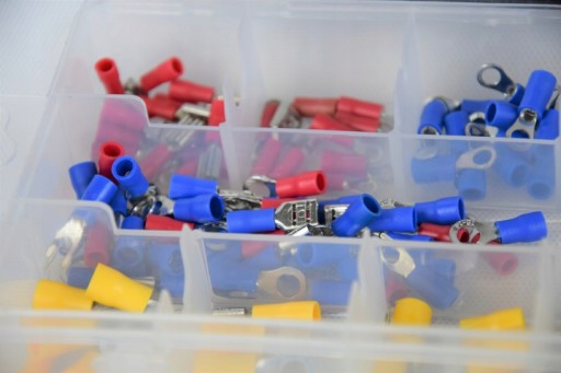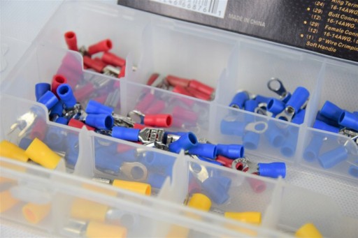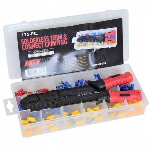 Zestaw złączek elektrycznych 175-cio częściowy wyposażony jest w tulejki izolujące, konektory płaskie żeńśkie, konektory płaskie